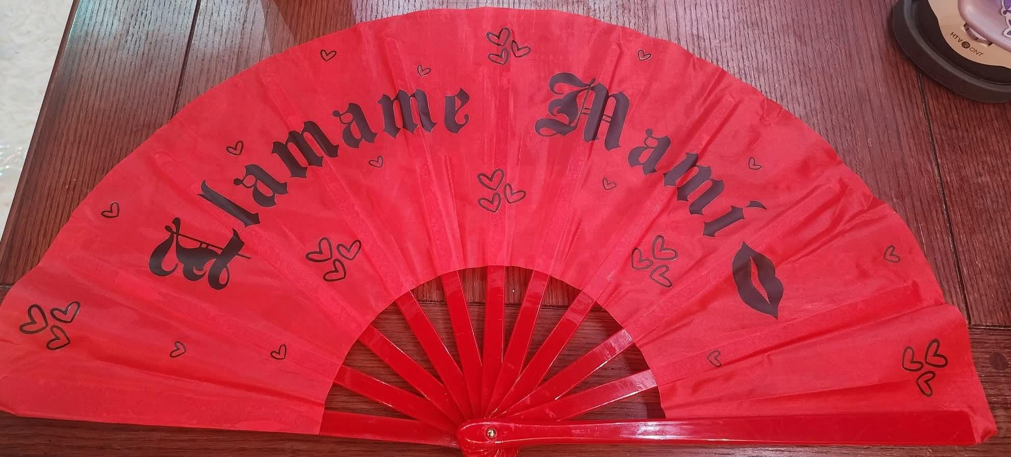 Custom wording - please limit to 5 words max depending on phrase, any questions don't hesitate to reach out! Sizing will depend on how many words are on the fan and wording may be stacked to make it all fit. Comes in a velvet fan bag. Standard font is given unless other was noted in personalization.