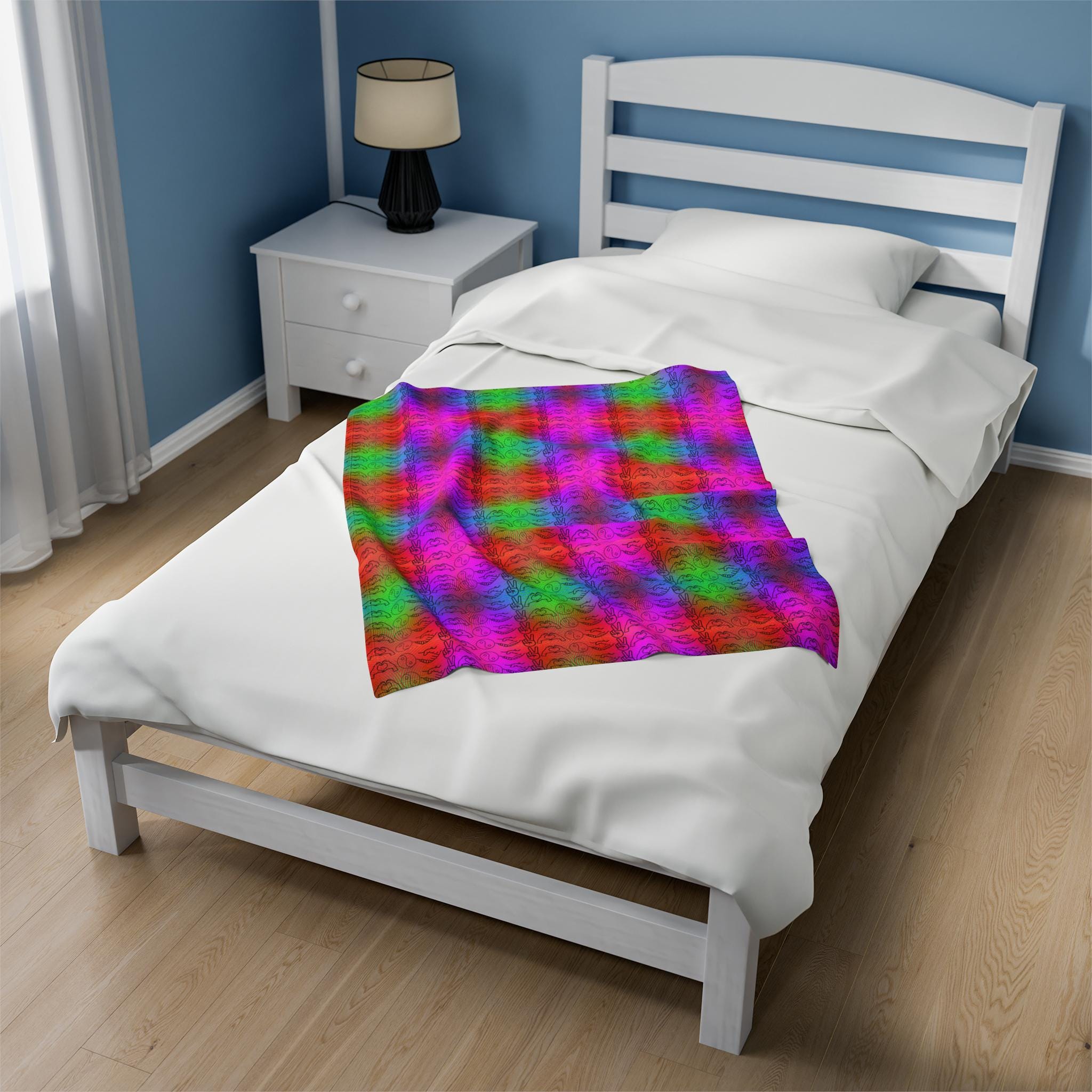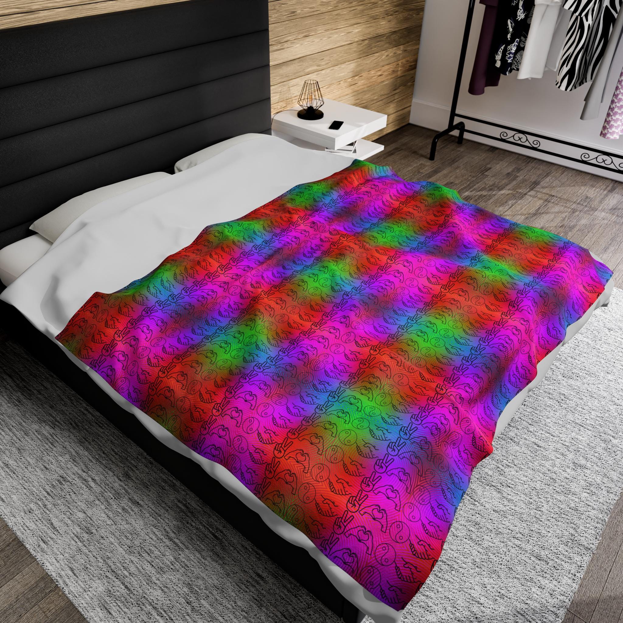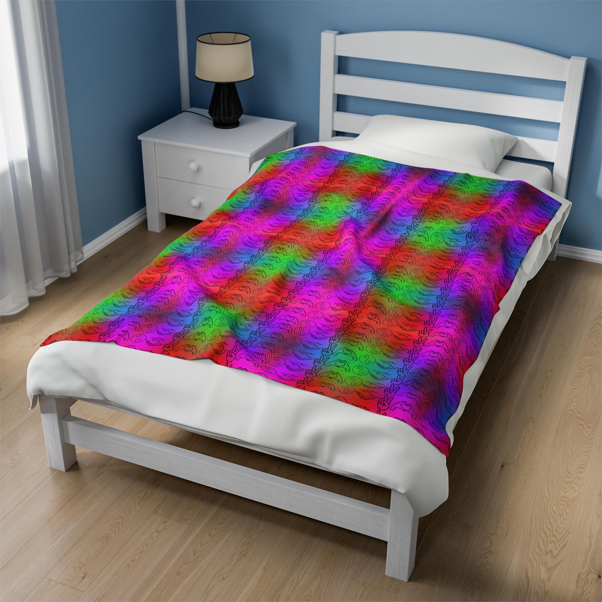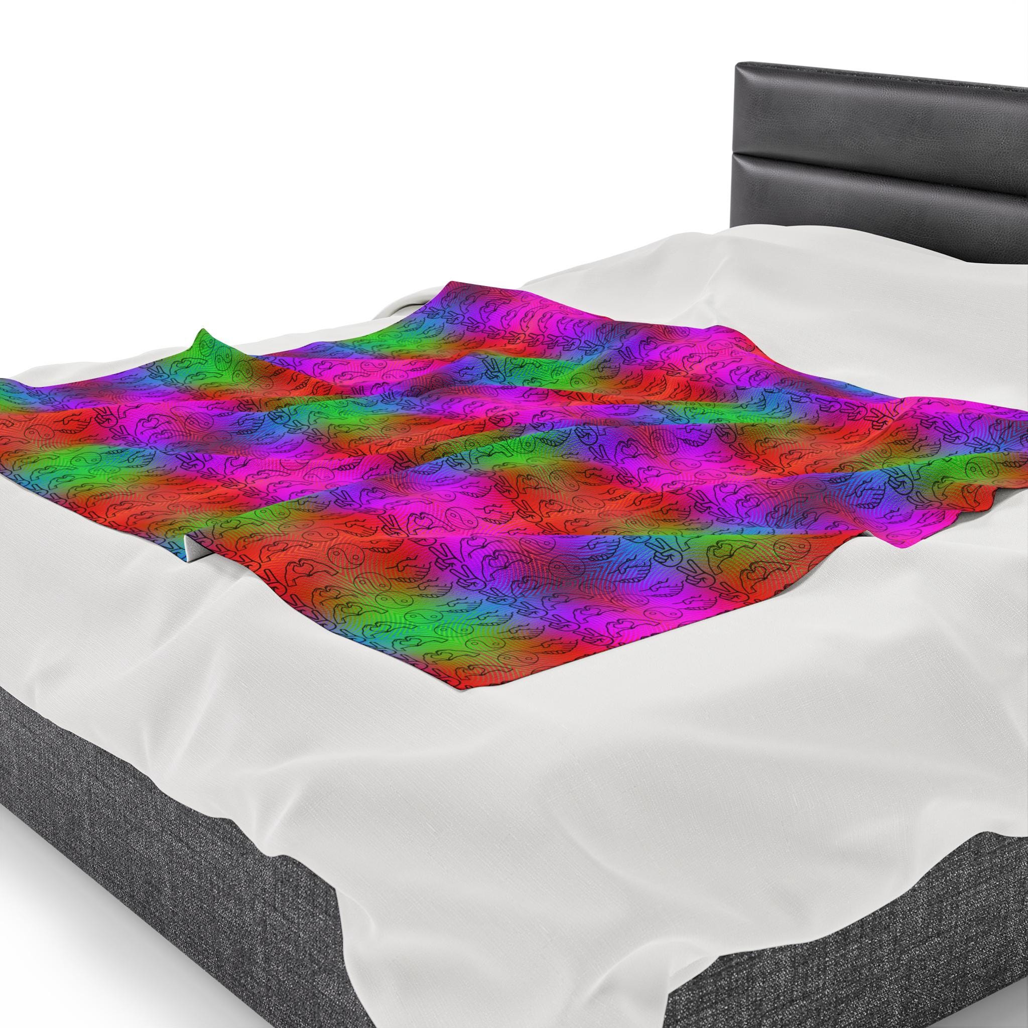 Show off your love for PLUR and the festival season with this velveteen plush blanket. Keep warm and cozy all year round with this soft and comfy blanket. Perfect for creating a warm and inviting atmosphere at home or as a thoughtful gift for friends and family. Ideal for festival-goers and music lovers.