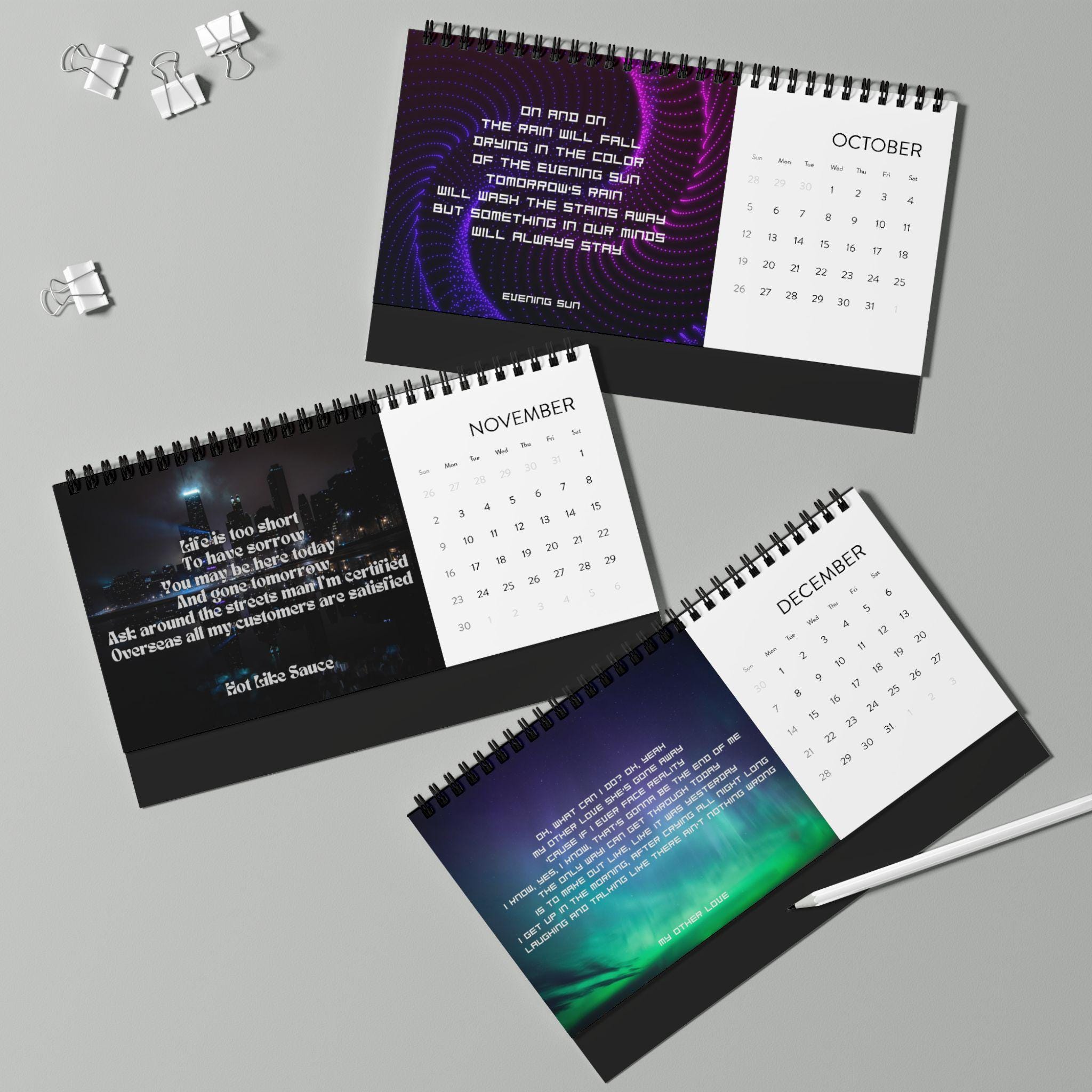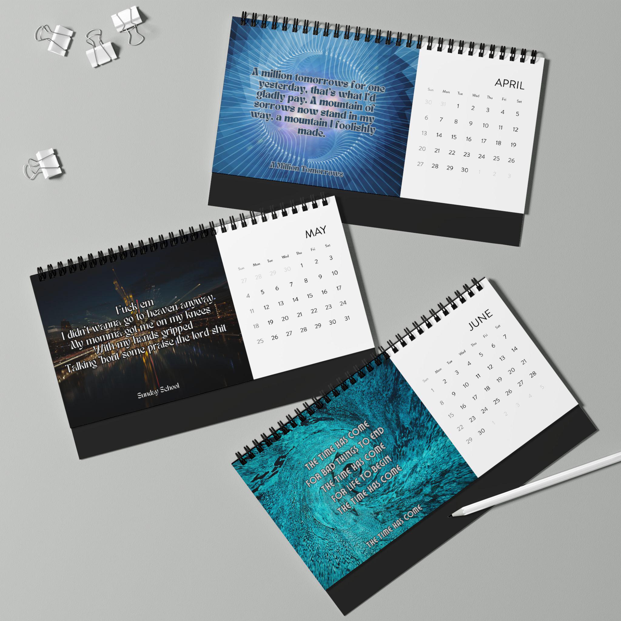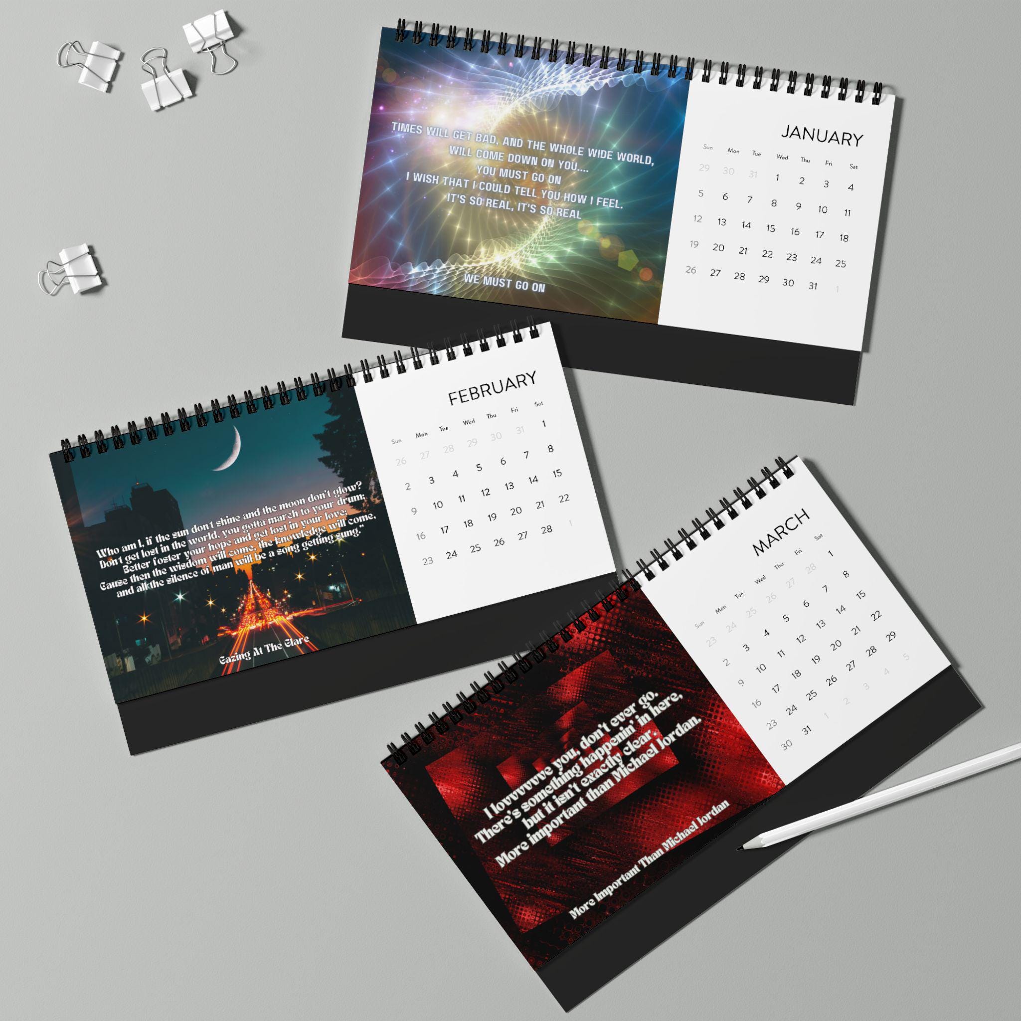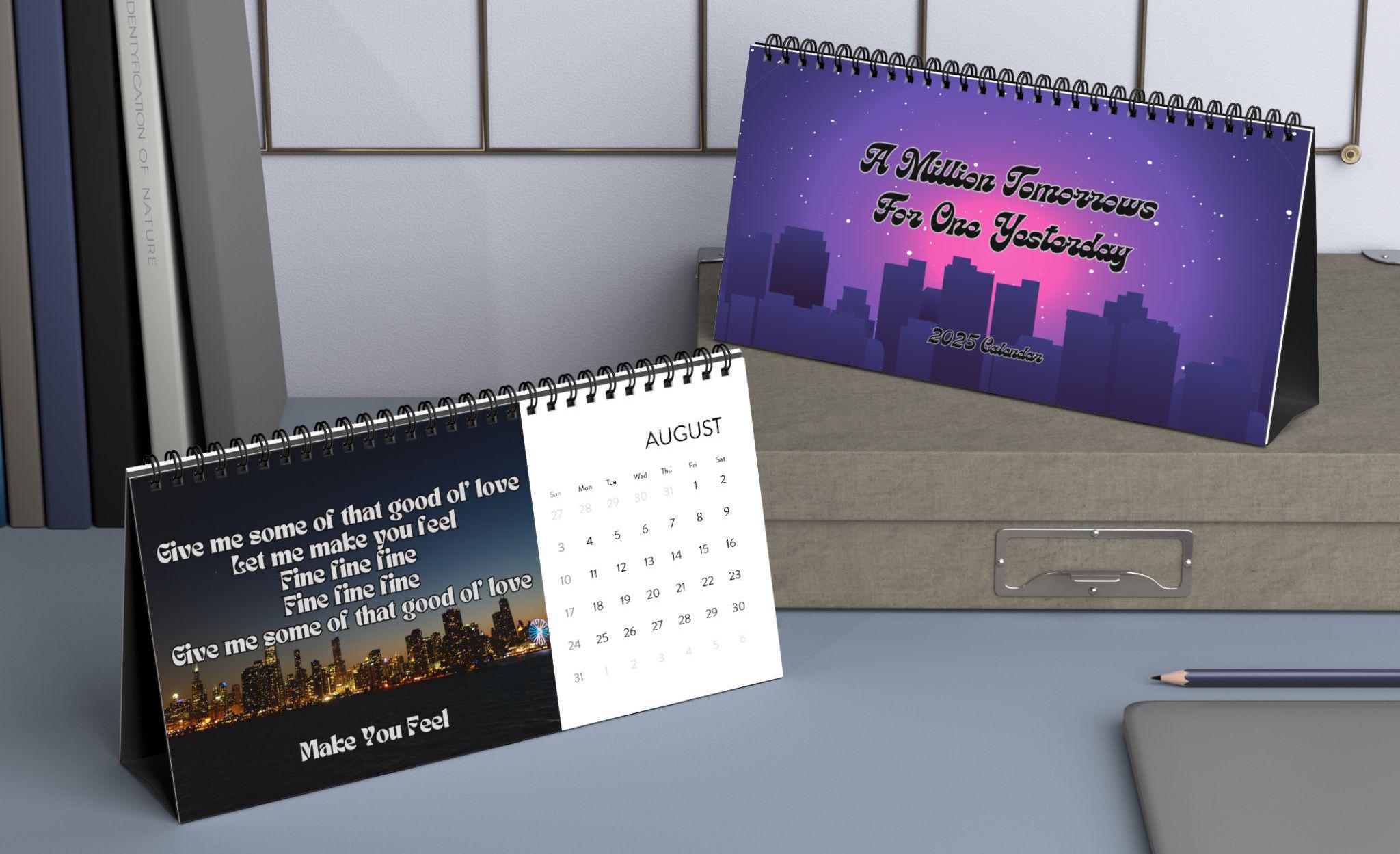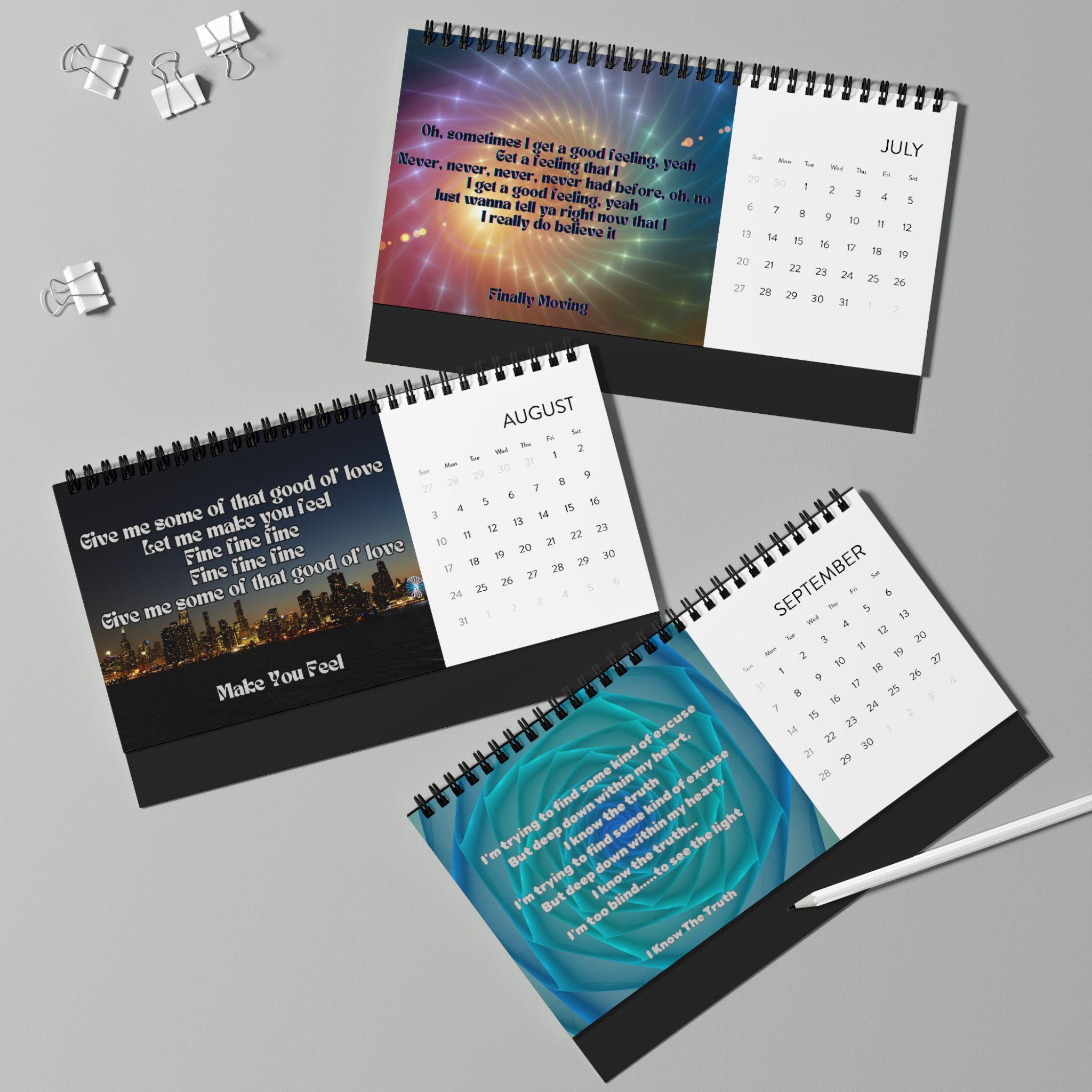 This vibrant Desk Calendar features lyrics from Pretty Lights Music, adding a unique touch to your workspace. Bound with a black metal spiral and tent card backing for an elegant look, this calendar is perfect for music lovers and fans of Pretty Lights. Ideal for those who appreciate colorful designs and want to stay organized in 2025.