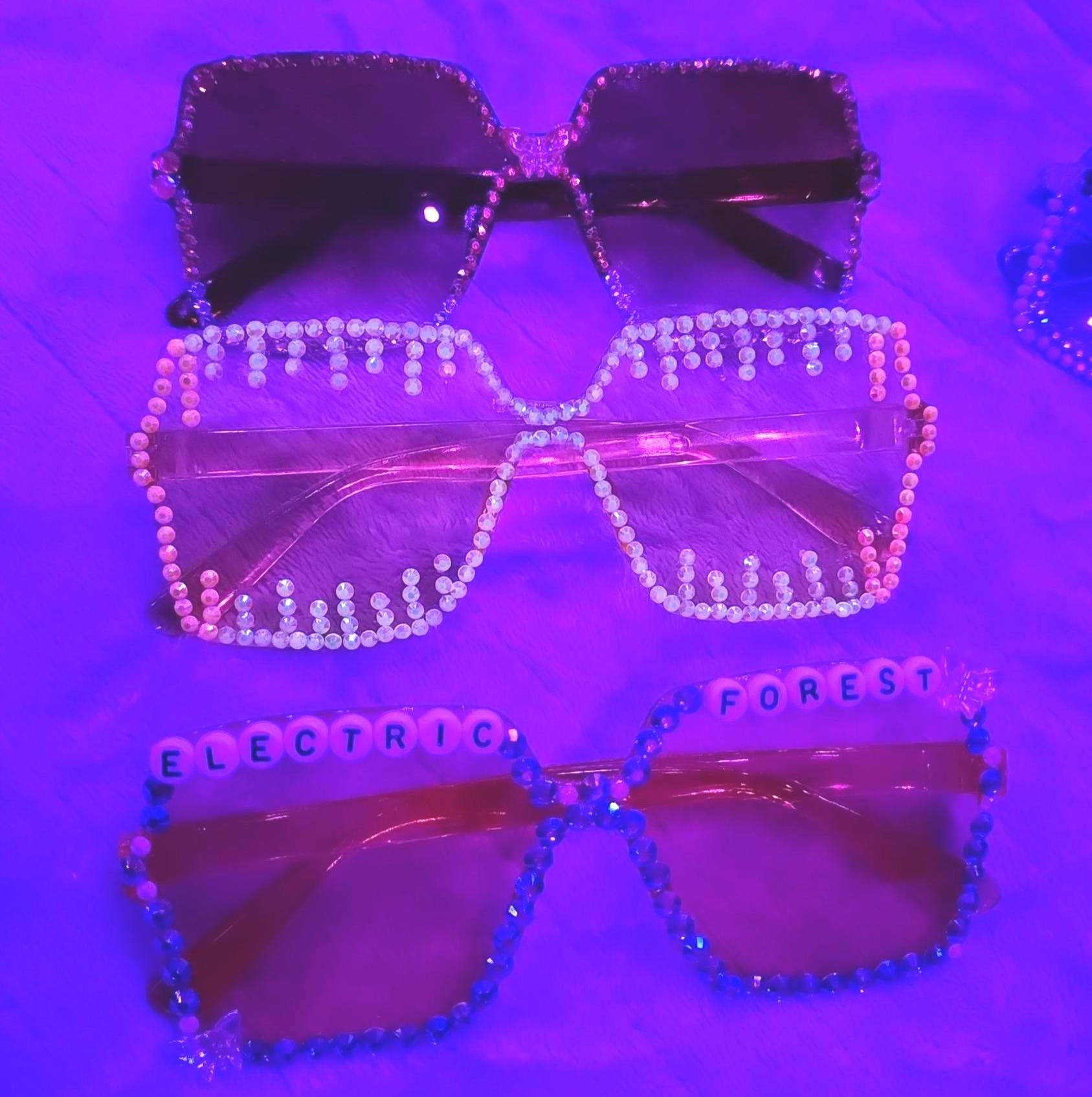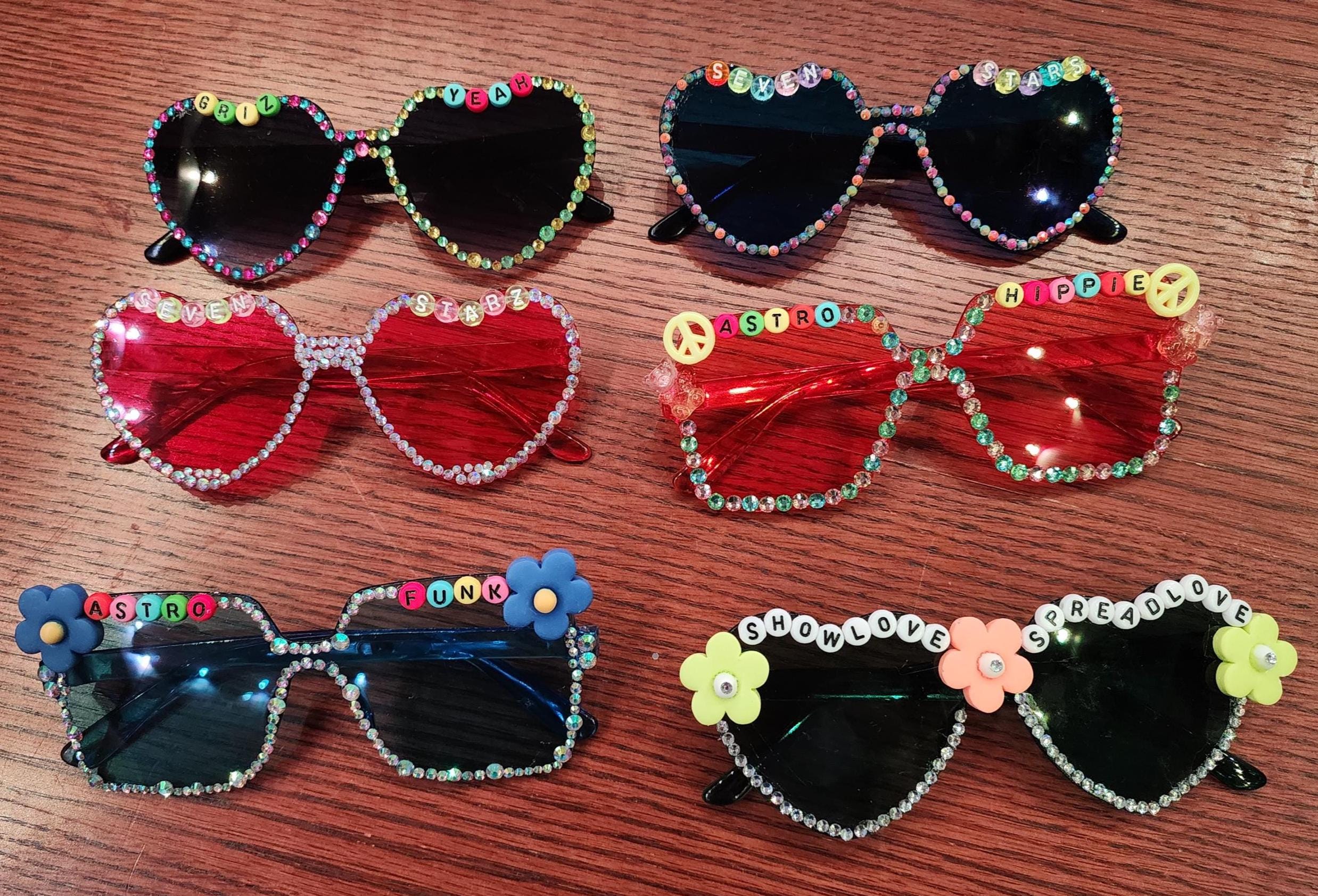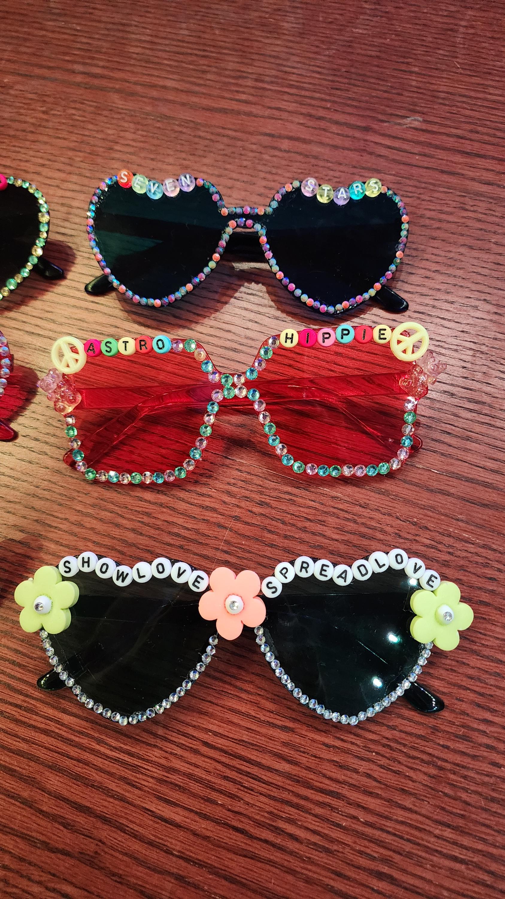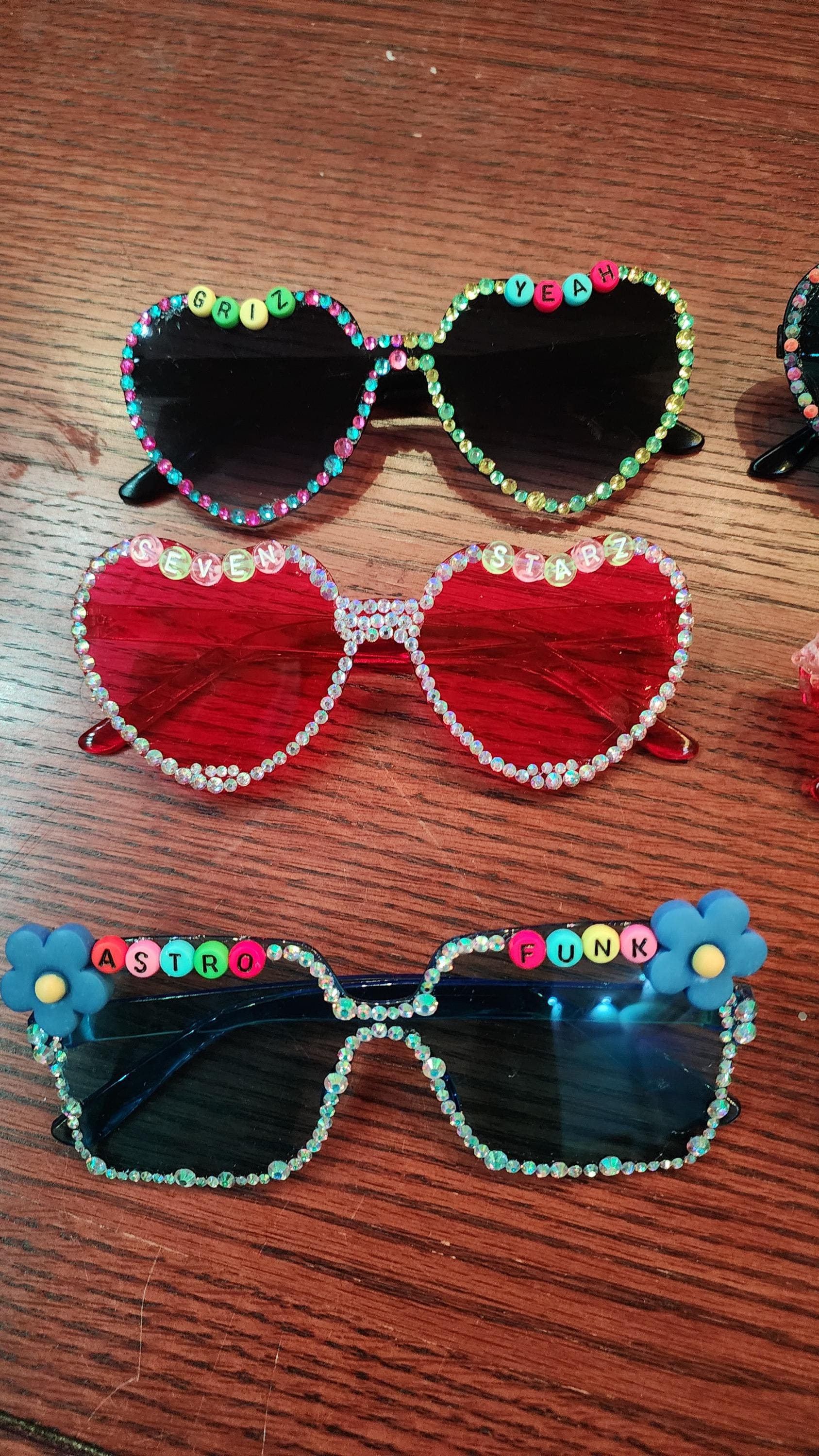 These can be personalized to your liking! I have hearts, cateye hearts, stars and squares for the sunglasses shape! So many colors to choose from! Perfect for a gift for friends and family for any event!! This is the perfect accessory to compliment any outfit!! You can choose words or lyrics to add to these! Great for concerts, parties, birthdays, bachelorette parties, weddings or just something fun for your next festival! These are fully customizable that come in soo many different colors! Some rhinestone colors glow under Black light! *updating photos soon!*